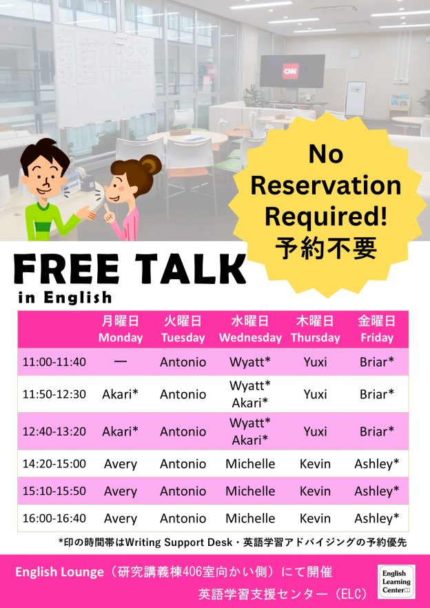フリートークは、研究講義棟4階のイングリッシュラウンジにて毎日開催されています。ELCのイングリッシュ・アドバイザーや海外からの留学生たちと気軽におしゃべりいたしましょう!
