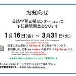 1/16(金)~3/31(火)の間、ELCは閉室となります。詳しくは上掲のポスターをご確認ください。借りている図書のある卒業予定の方は、3/31(火)までに必ずご返却ください。