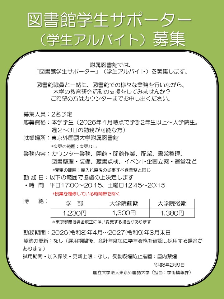 「図書館学生サポーター」(学生アルバイト)募集【2/13 募集終了しました】 2026.02.09 附属図書館では「図書館学生サポーター」(学生アルバイト)を募集します。下記の要項をご覧のうえ、ご希望の方はカウンターまでお申し出ください。 ※募集は2月13日11:00分の受付を持って終了しました。